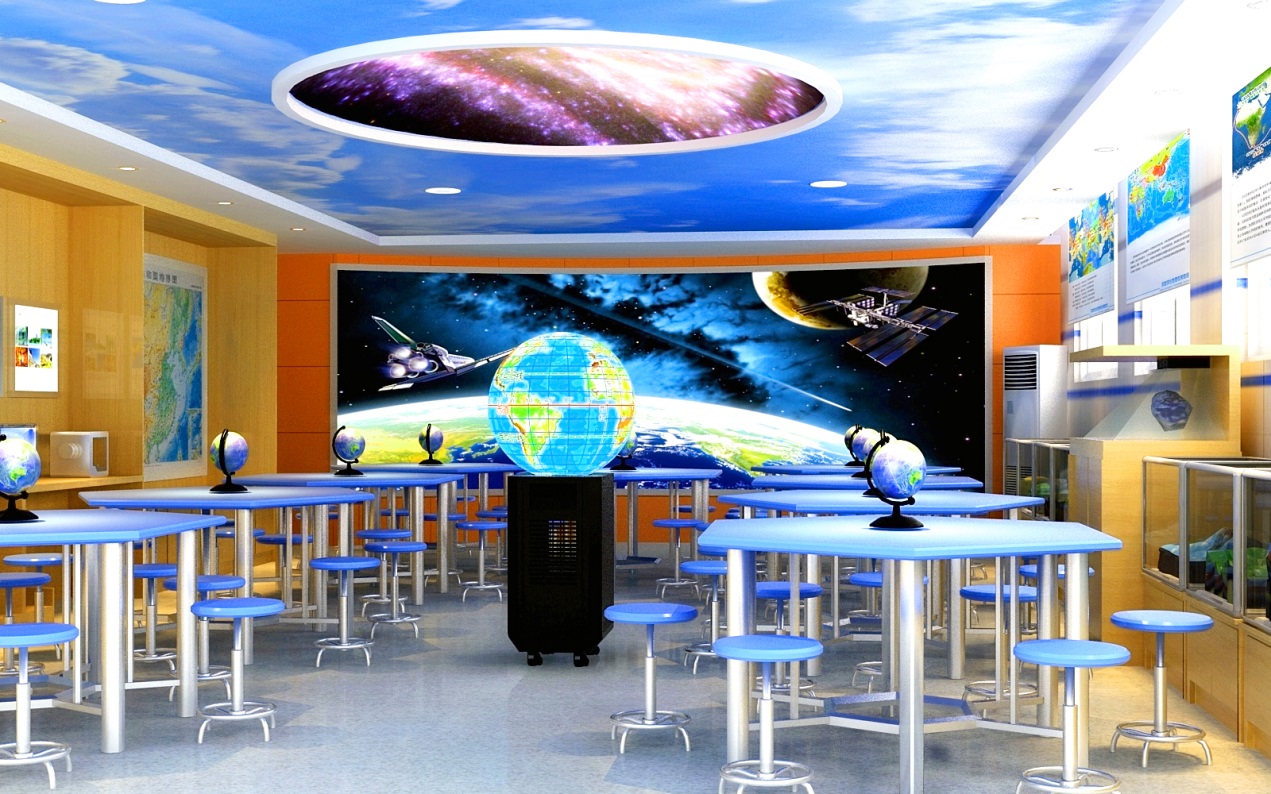 數(shù)字星球系統(tǒng)是當前地理教室建設的核心設備,它能從平面到立體、一球變多 球、靜 止到動態(tài)、展示過去 、現(xiàn)在 、將來地理變化信息,為學生提供身臨其境的教學情境,營造濃郁的學科氛圍。